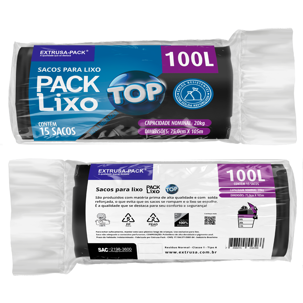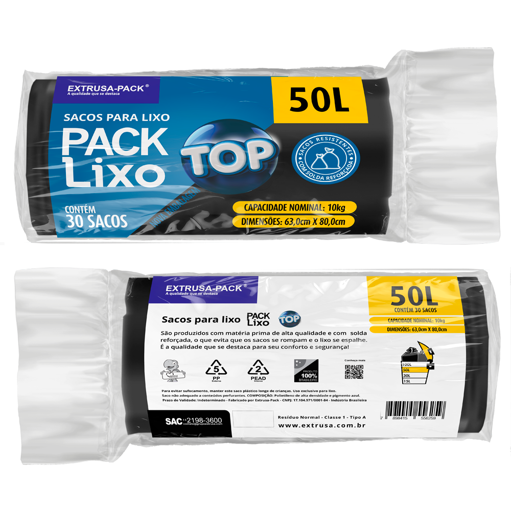 Conheça o Pack Lixo Top. Sacos para lixo reforçados disponível nas cores azul, branco ou preto, resistentes e fabricados com matéria prima reciclável fabricada pela Extrusa Pack.