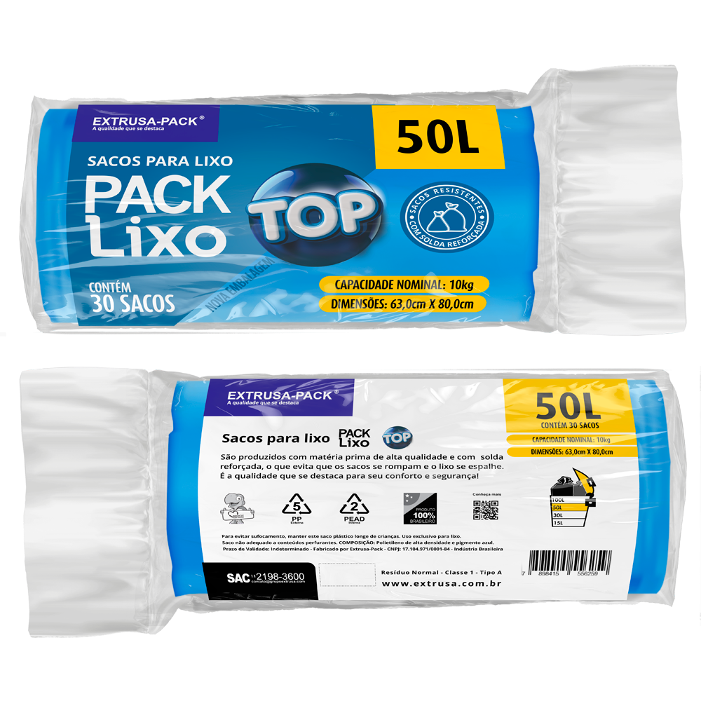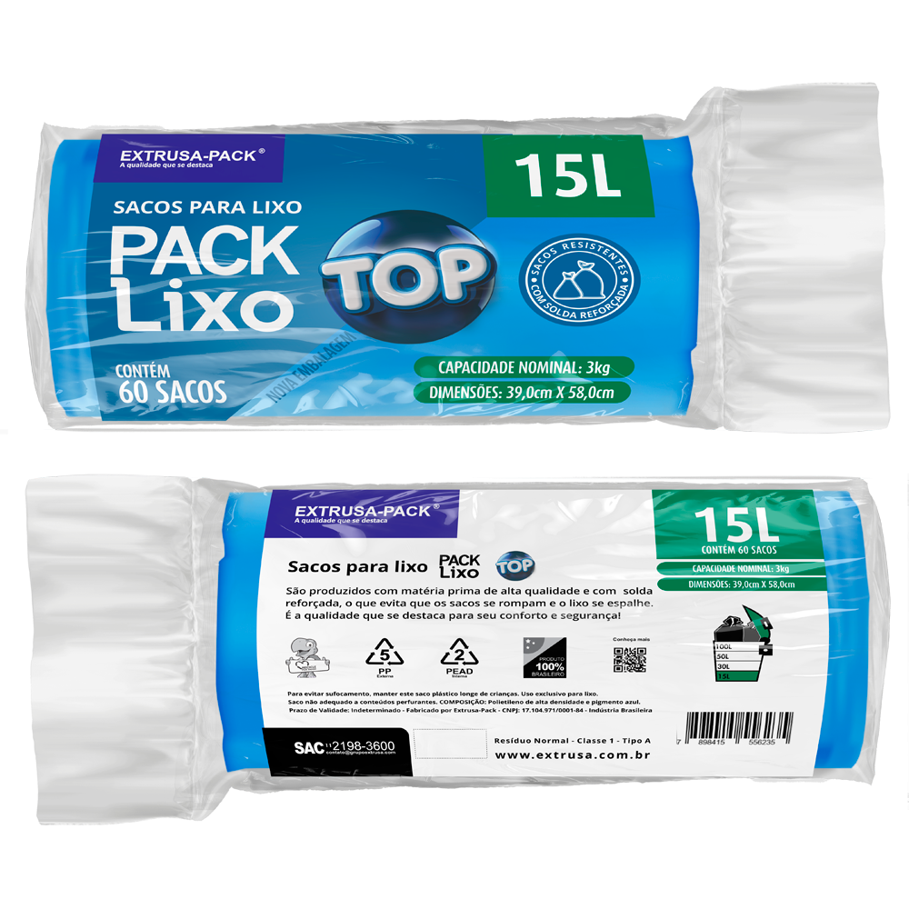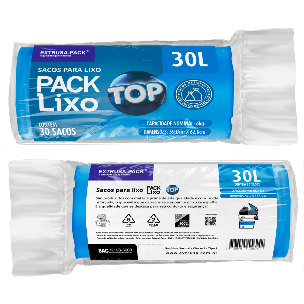 Conheça o Pack Lixo Top. Sacos para lixo reforçados disponível nas cores azul ou preto, resistentes e fabricados com matéria prima reciclável fabricada pela Extrusa Pack.